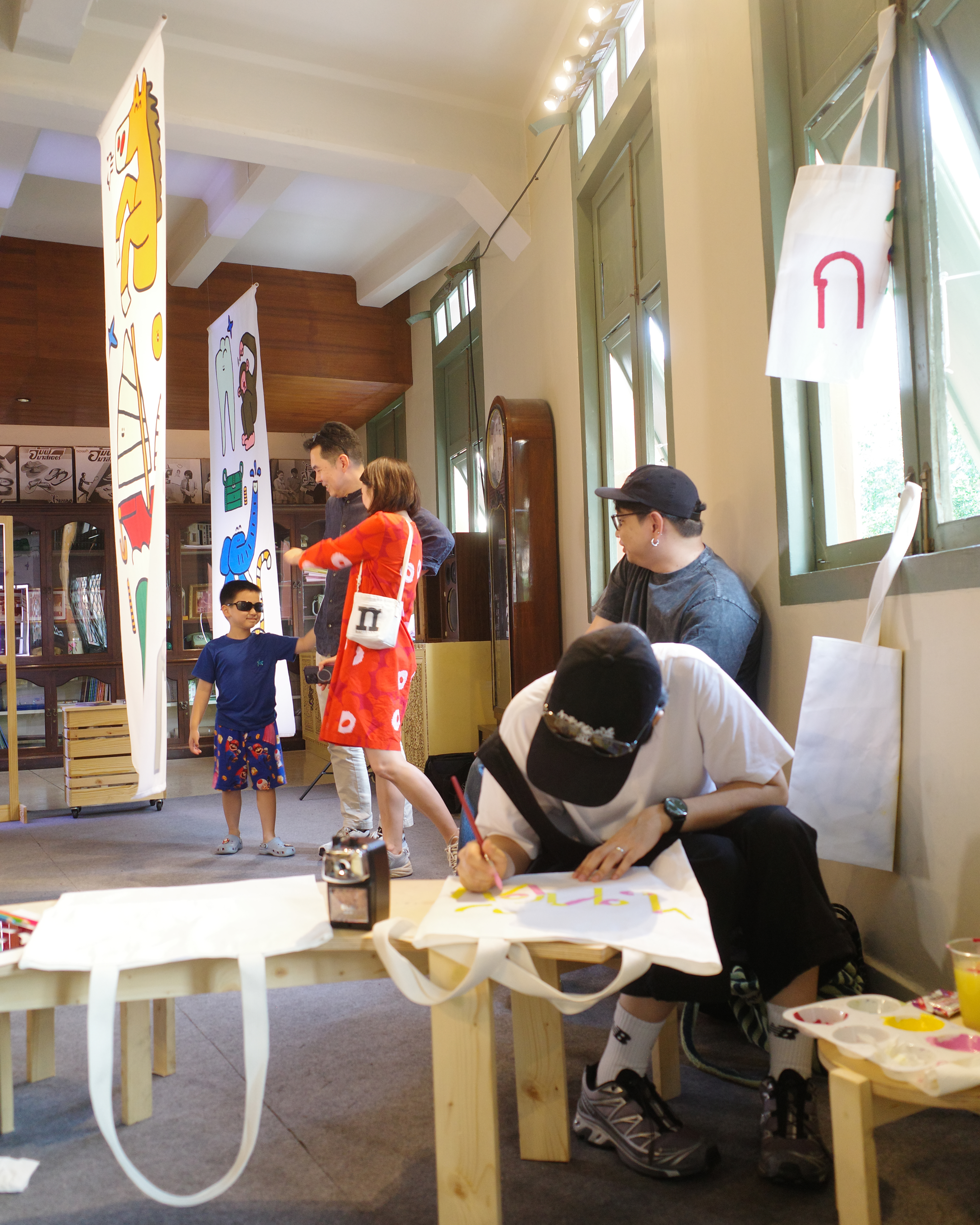 GOR-HOR Workshop Learning by doing to step into the new dawn of the drawing the Thai Alphabet with Tote bag painting workshop. Using unique characteristic Thai alphabet elements template to enjoy creating complete characters.