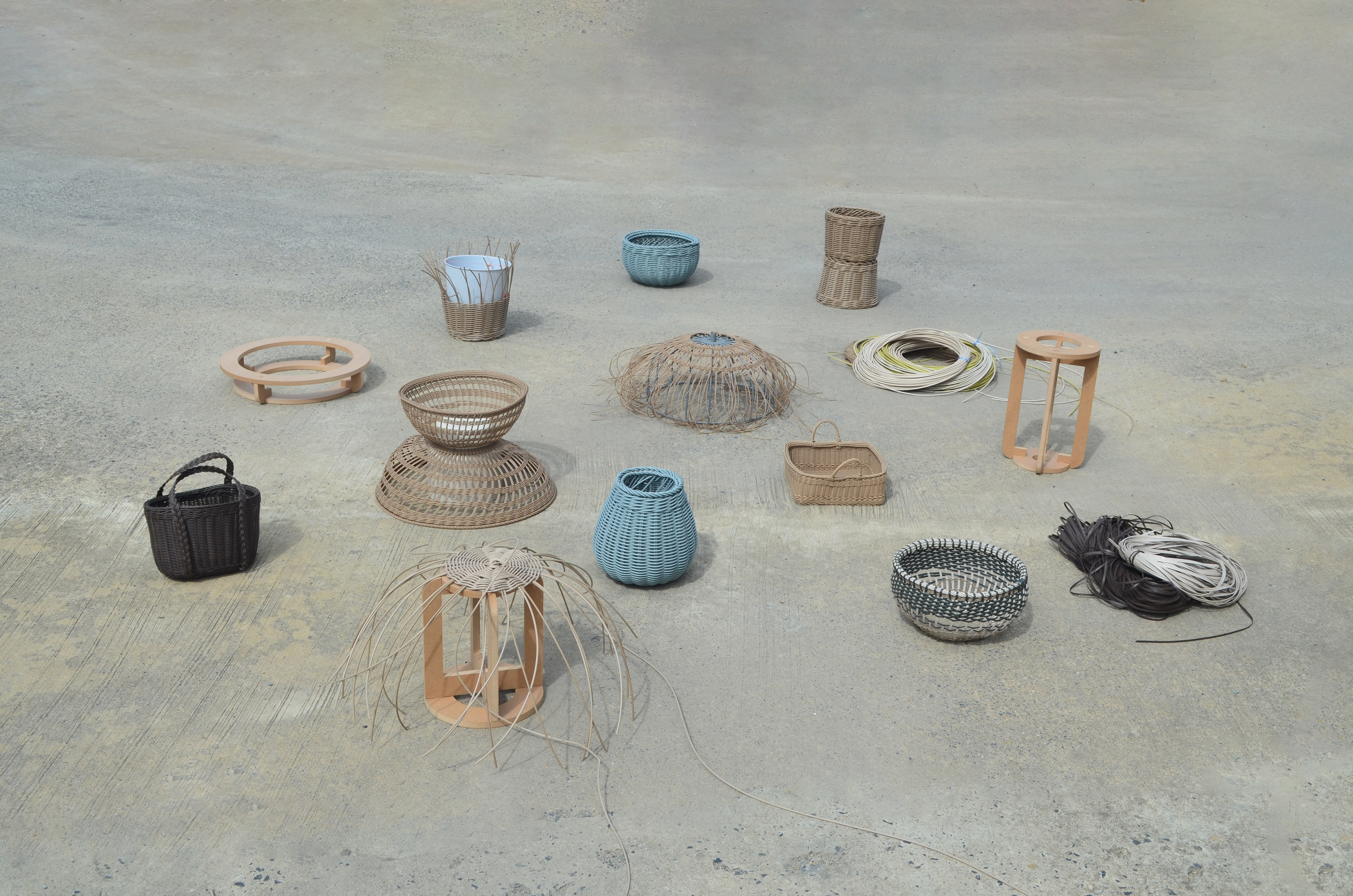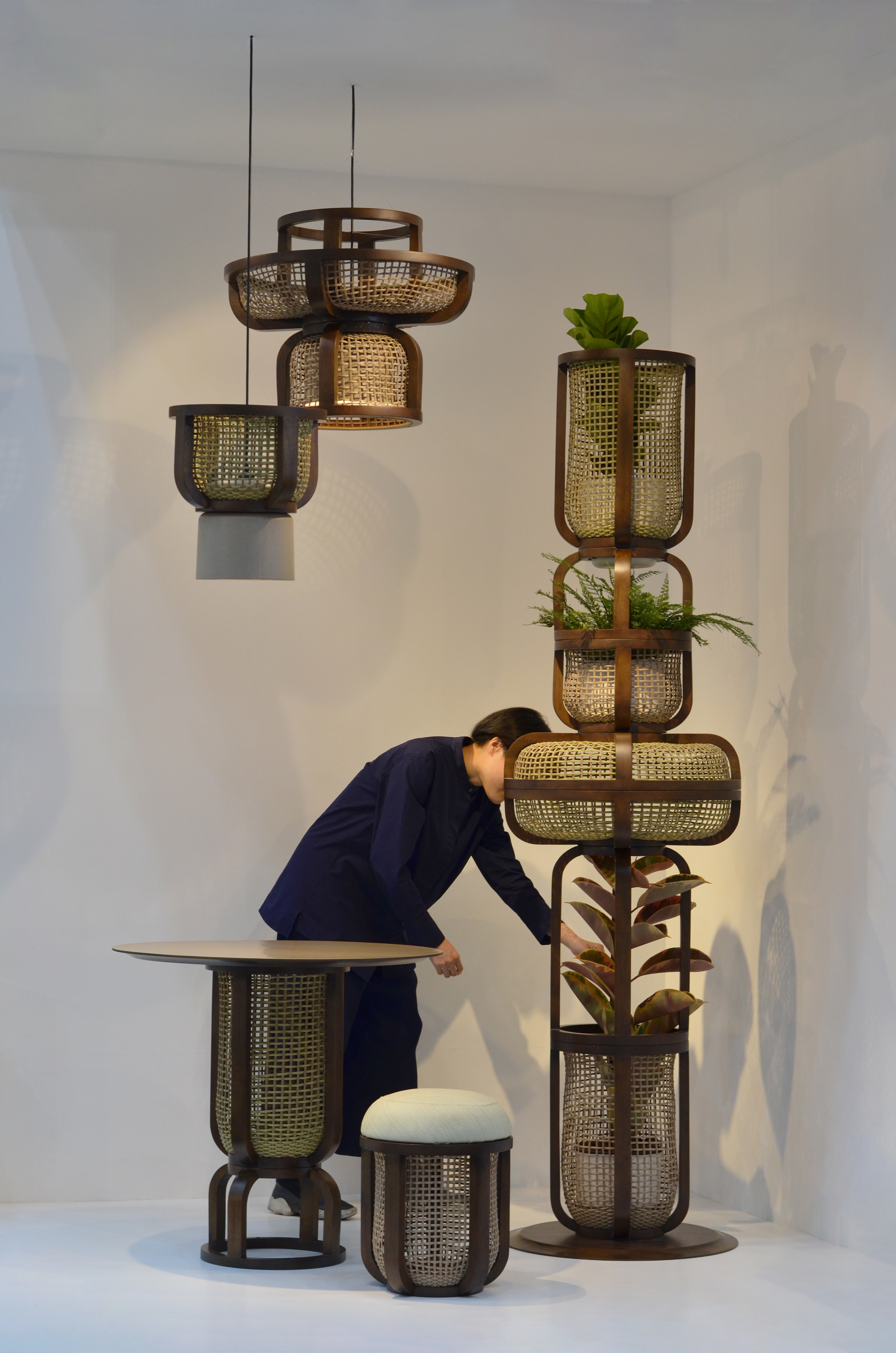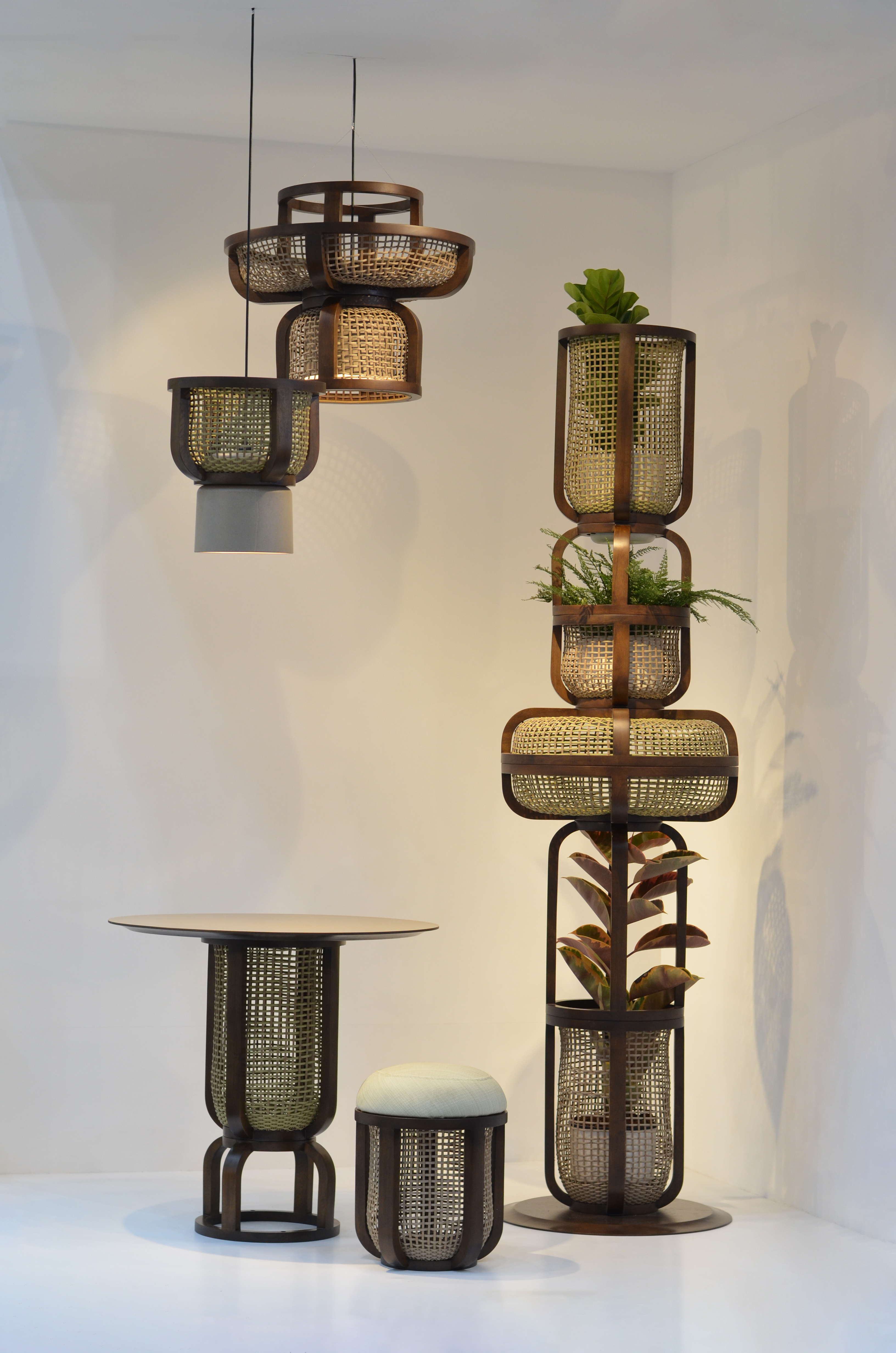 Vertical Basket collection is a set of furniture consisting of a stool, table, vertical planter, and lamp. The design process involved combining technology, design, and traditional weaving techniques to create a range of functional items using the same structure.